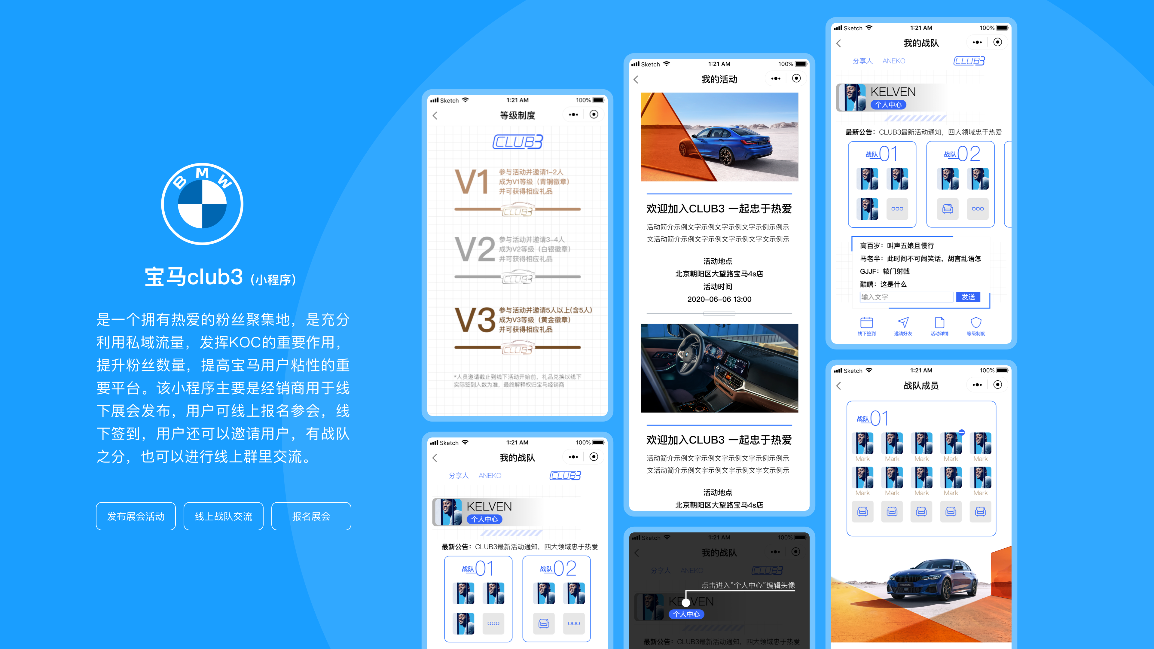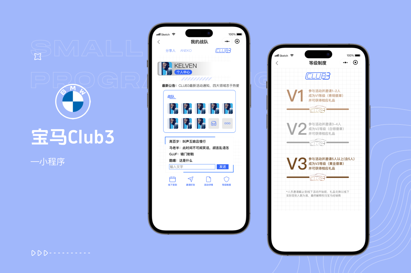 寶馬這個小程序——Club3,是一個擁有熱愛的粉絲聚集地,是充分利用私域流量,發(fā)揮KOC的重要作用,提升粉絲數(shù)量,提高寶馬用戶粘性的重要平臺。該小程序主要是經(jīng)銷商用于線下展會發(fā)布,用戶可線上報名參會,線下簽到,用戶還可以邀請用戶,有戰(zhàn)隊之分,也可以進行線上群里交流。