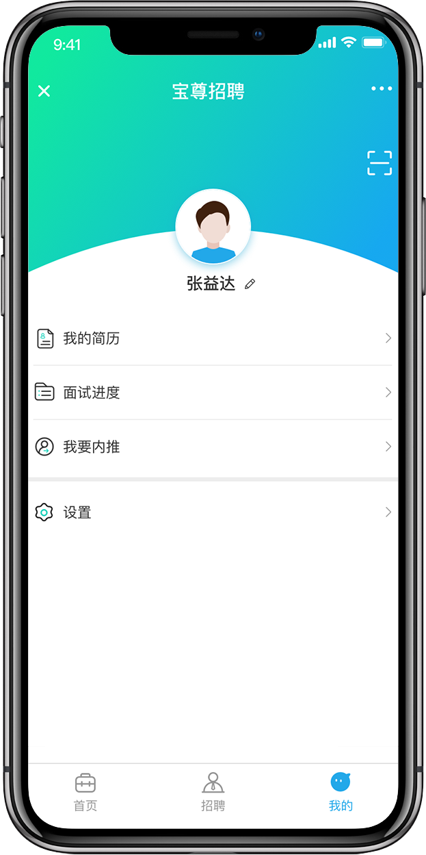 主要是登錄寶尊公眾號后,進(jìn)入招聘功能的用戶,我的部分主要是展示我的簡歷、面試進(jìn)度、我要內(nèi)推和設(shè)置功能。
