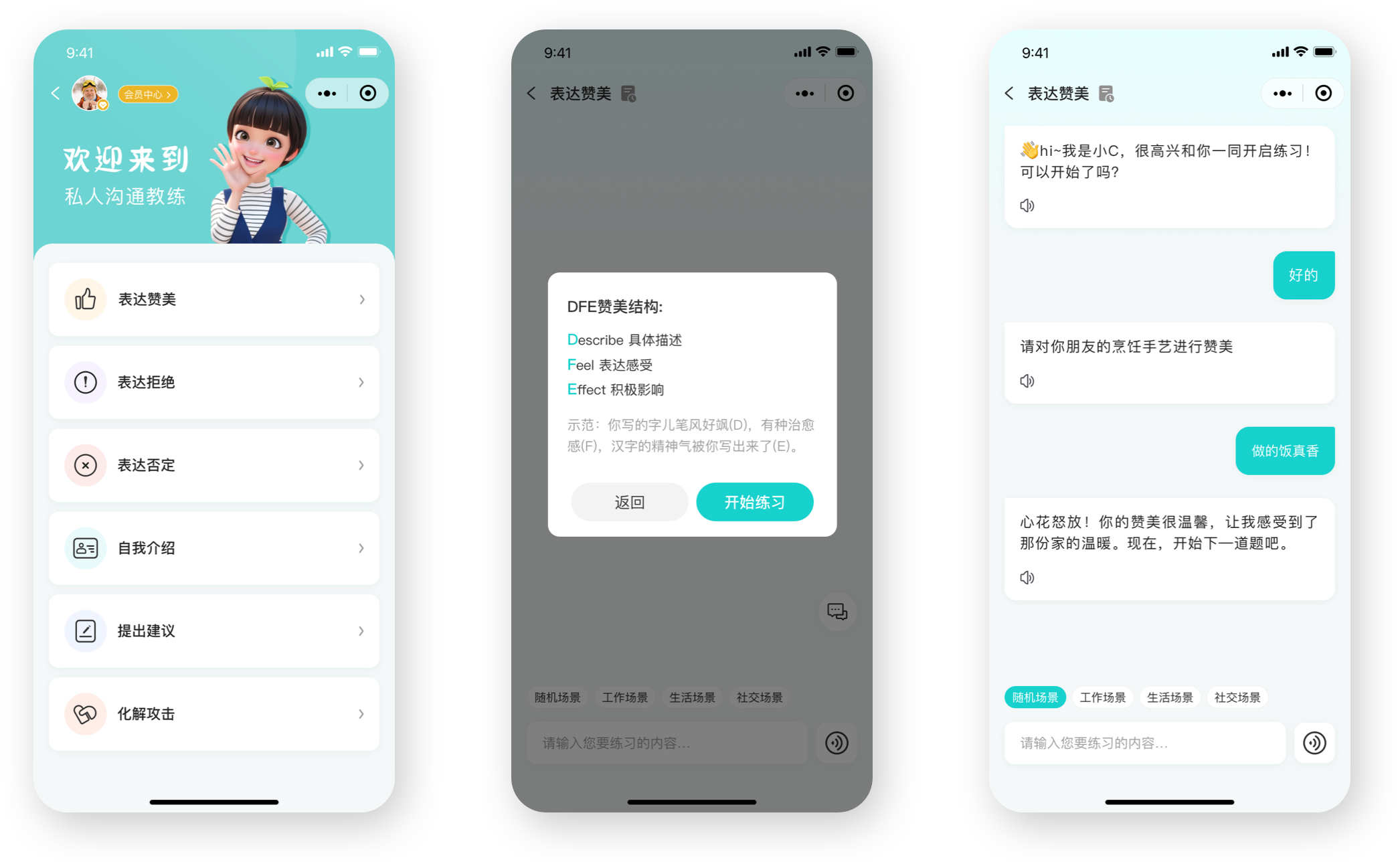 私人溝通教練模塊,可以幫助用戶提高溝通技巧,實(shí)現(xiàn)高情商溝通。包括學(xué)會(huì)表達(dá)贊美、表達(dá)拒絕、表達(dá)否定、進(jìn)行自我介紹、提出建議、化解攻擊等模塊。