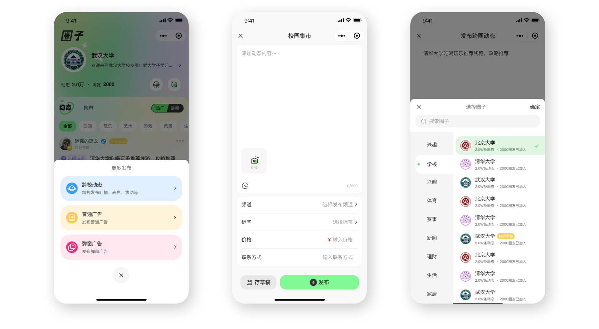主要是進(jìn)行YOYO校友圈的內(nèi)容發(fā)布,分為跨校動(dòng)態(tài)(跨校發(fā)布吐槽、表白、求助等信息)、普通廣告和彈窗廣告。校園集市發(fā)布,分為發(fā)布的內(nèi)容、頻道、標(biāo)簽、價(jià)格、聯(lián)系方式的選擇等,并進(jìn)行學(xué)校的選擇。