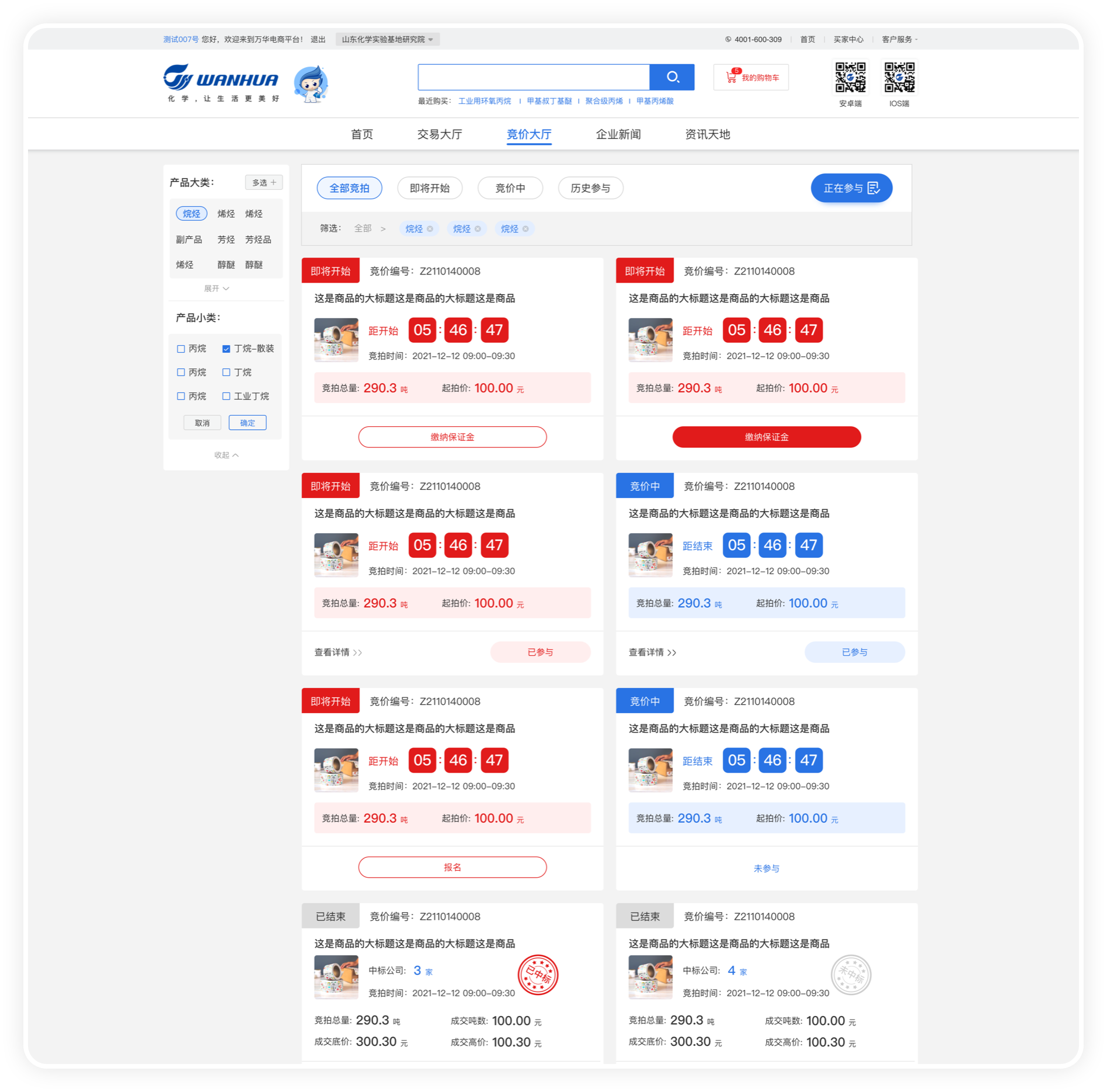 又分為全部競拍產(chǎn)品、即將開始競拍產(chǎn)品、競價中產(chǎn)品和歷史參與的競拍產(chǎn)品。