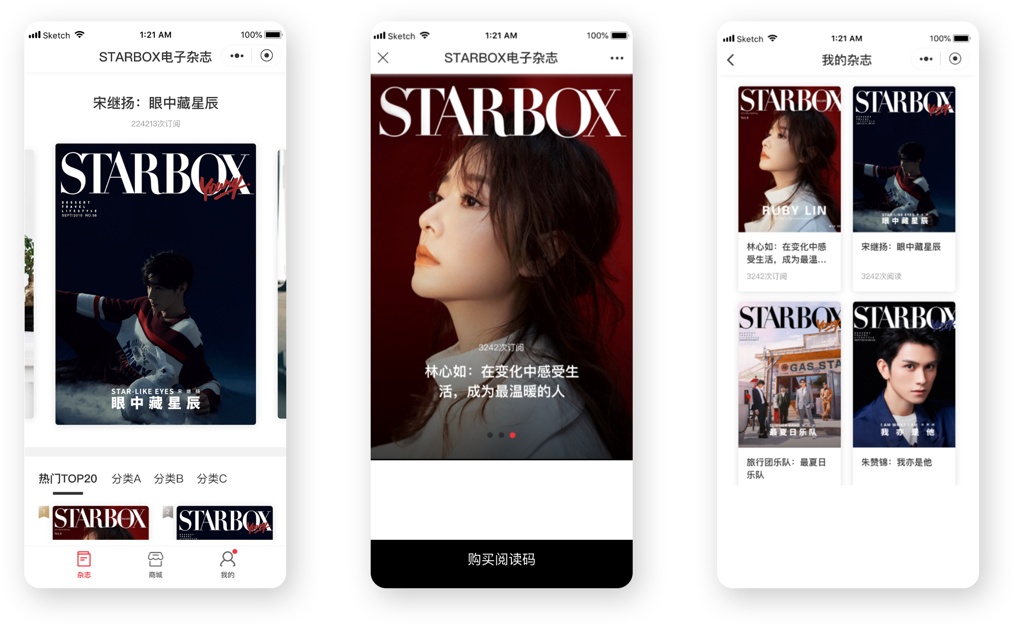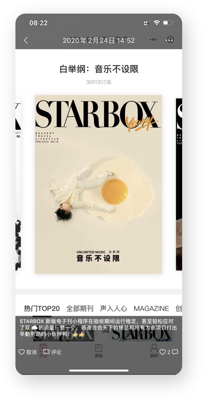 《STARBOX電子雜志》是一款微信小程序,《STARBOX》電子刊是本聚焦年輕偶像以及獨(dú)特個(gè)性的意見領(lǐng)袖,分享他們生活方式的潮流特刊。 讀者通過微信小程序可直接挑選所喜歡的雜志,購(gòu)買相應(yīng)閱讀碼,通過輸入閱讀碼閱讀雜志。同時(shí)用戶可以預(yù)覽雜志,可以查看已購(gòu)買的雜志和閱讀碼。 雜志內(nèi)容包括圖文詳情、視頻、人氣排行等等。