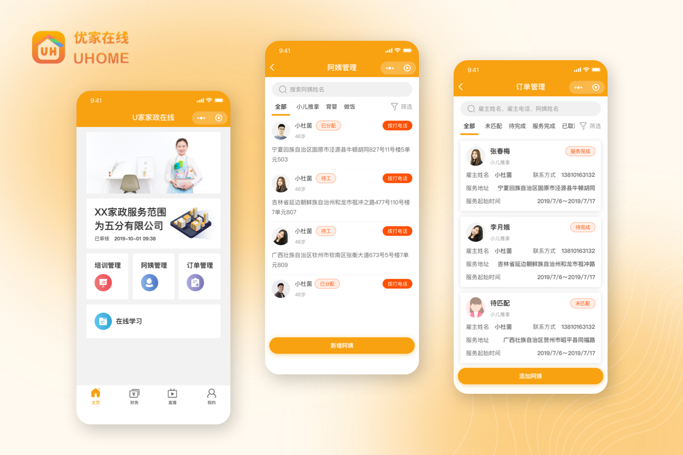 U家家政在線提供家政從經(jīng)營(yíng)到培訓(xùn)的一站式管理服務(wù),包括員工管理、訂單管理、培訓(xùn)平臺(tái)搭建等;全套互聯(lián)網(wǎng)+管理工具,助力家政企業(yè)快速、高效擴(kuò)展業(yè)務(wù),節(jié)省大量運(yùn)營(yíng)成本。包括阿姨管理、訂單管理、培訓(xùn)管理等。