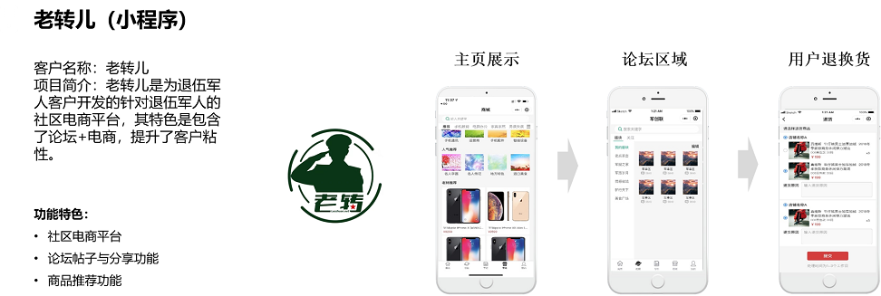 老轉(zhuǎn)兒是退伍軍人客戶開發(fā)的針對(duì)退伍軍人的社區(qū)電商平臺(tái),其特色是包含論壇+電商,通過論壇帖子+分享+商品推薦的功能,提升用戶粘性,通過社區(qū)來做電商,緊緊把握社區(qū)電商發(fā)展的新時(shí)代的趨勢(shì),聚焦退伍軍人這一專業(yè)細(xì)分群體。