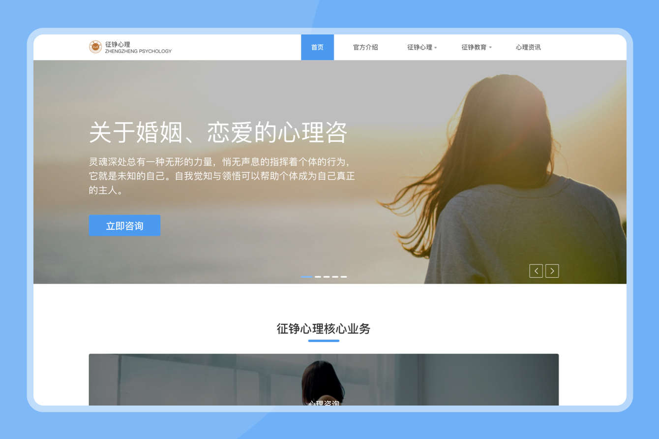 征錚心理由海歸心理學(xué)博士王錚創(chuàng)立,以“助力中國(guó)父母,成就天下少年”為發(fā)展愿景,堅(jiān)持“以人為本,知行合一“的工作理念,致力于兒童青少年潛能開發(fā)、學(xué)習(xí)力提升、行為問(wèn)題矯正,在多領(lǐng)域開展科學(xué)研發(fā)、教學(xué)培訓(xùn)的社會(huì)心理服務(wù)品牌。北京合合科技承接了幫助征錚心理設(shè)計(jì)研發(fā)PC官網(wǎng)和小程序,助力其在心理咨詢領(lǐng)域開展更多心理服務(wù)。