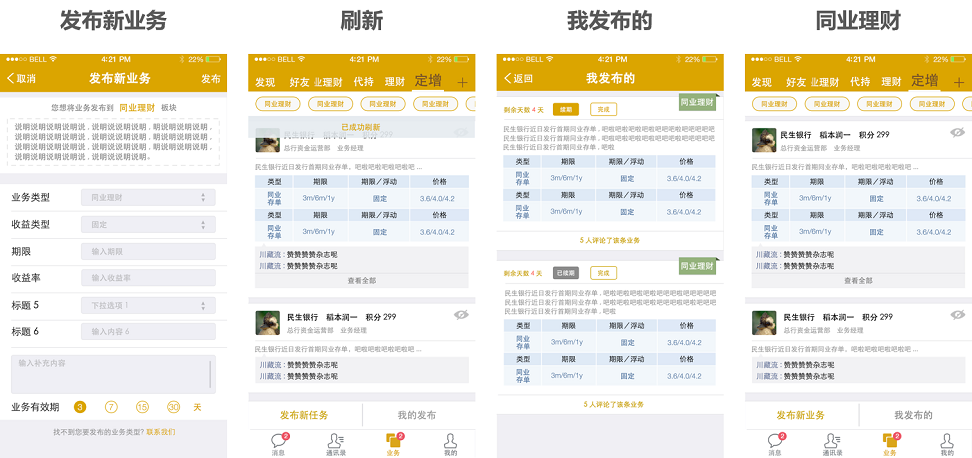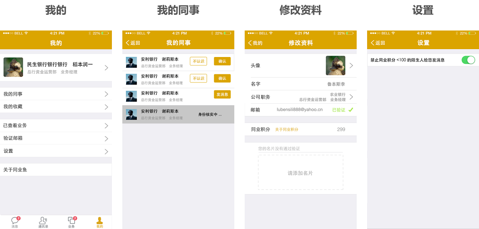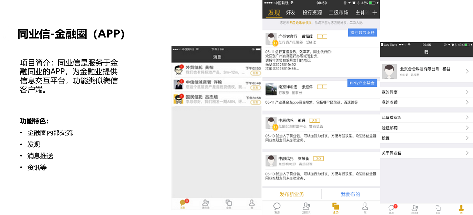 同業(yè)信是服務(wù)于金融同業(yè)的APP,為金融業(yè)提供信息交互平臺(tái),功能類似微信客戶端。主要特色功能包括金融圈內(nèi)部交流、發(fā)現(xiàn)、消息推送、資訊、二級(jí)市場(chǎng)等。