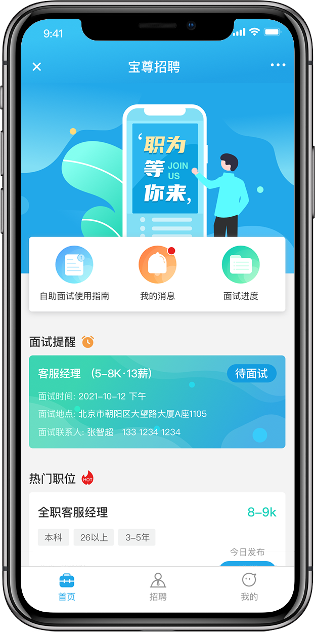 最上面為整體展示的輪播圖,下面主要包括自助面試使用指南,我的消息、面試進(jìn)度;中間是面試提醒,如果有待面試信息,就會展示在這里,再下面是招聘崗位的展示。對于應(yīng)聘人員可以打開查看崗位,選擇一鍵投遞。