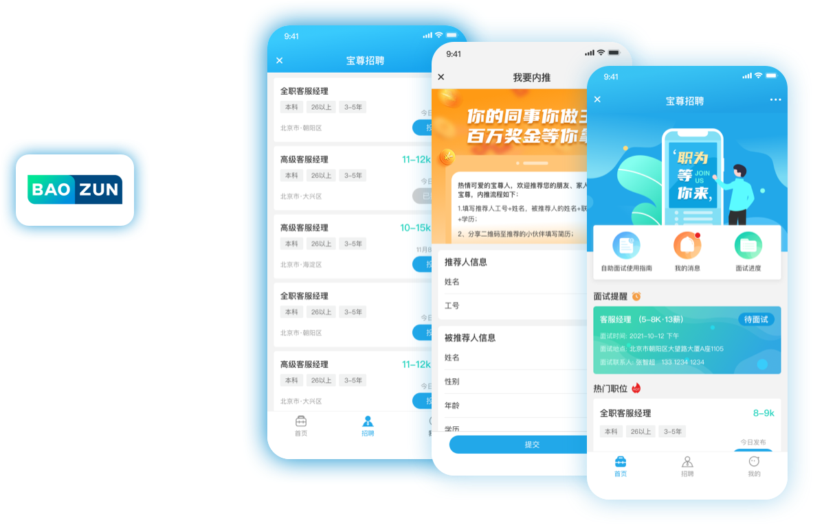 主要是登錄寶尊公眾號后,進(jìn)入招聘功能的用戶,我的部分主要是展示我的簡歷、面試進(jìn)度、我要內(nèi)推和設(shè)置功能。