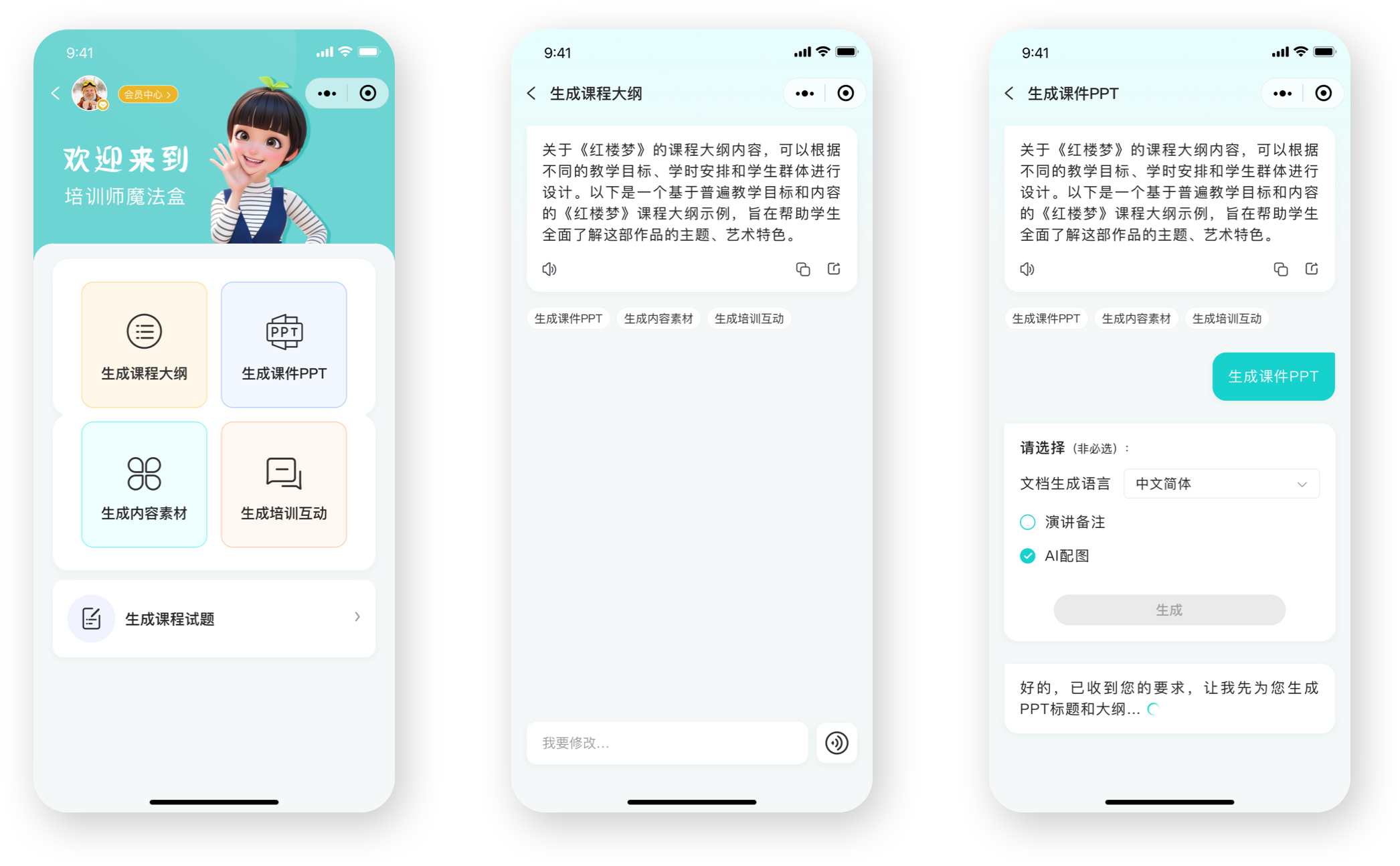 可以進(jìn)行培訓(xùn)信息完善,包括課程名稱(chēng)、所屬行業(yè)、培訓(xùn)企業(yè)、學(xué)院崗位、培訓(xùn)時(shí)長(zhǎng)、重點(diǎn)解決的問(wèn)題等,可以幫助用戶生成課程大綱、生成課件PPT、生成內(nèi)容素材、生成培訓(xùn)培訓(xùn)互動(dòng)等,還可以生成課程的試題。