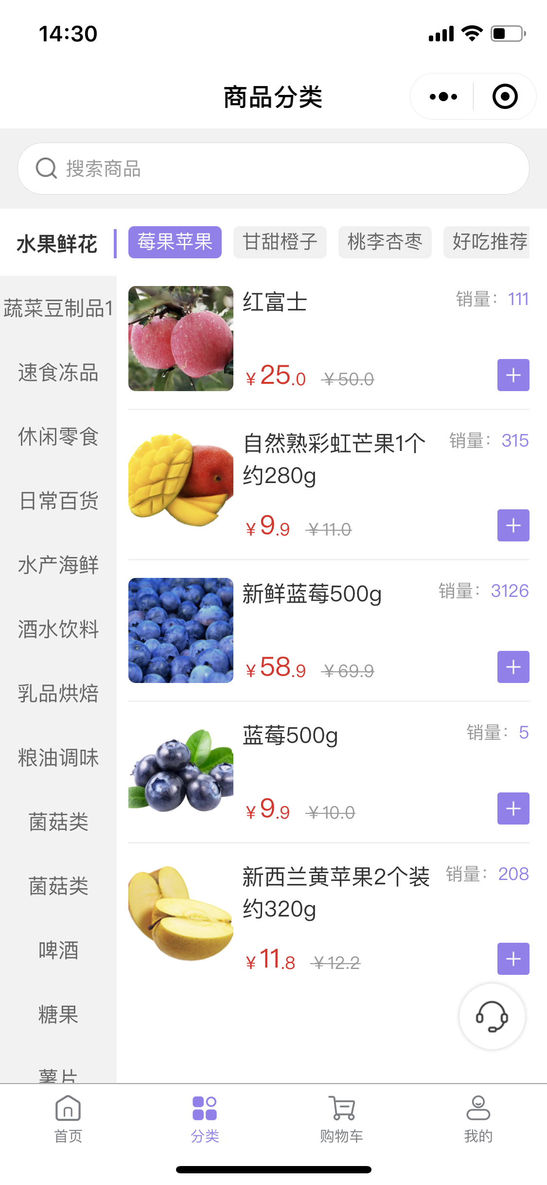在“分類”板塊,由于商超百貨的商品種類繁多,因此商品的分類更加細(xì)致,包括“蔬菜鮮果、速食凍品、休閑零食、水產(chǎn)海鮮、酒水飲料、乳品烘培、糧油調(diào)味”等多個分欄,用戶可以根據(jù)自己的需求自行瀏覽,也可直接在搜索欄搜索關(guān)鍵詞精準(zhǔn)查找。在選定商品后,用戶即可下單購買,生成訂單信息。“購物車”板塊主要是用戶加入購物車的商品信息,用戶可以將心儀商品加入到購物車中在商品失效前隨時購買。